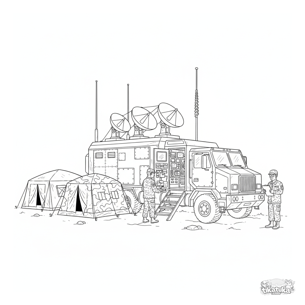 Coloring page for older kids 10-12: a detailed mobile command center truck with antennas is parked near a field headquarters. Soldiers are preparing equipment.