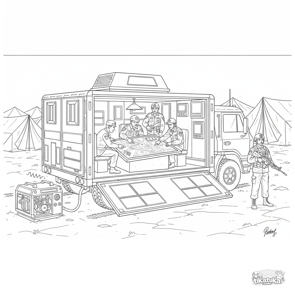 Complex coloring page of a mobile command center with expanded sides. For older kids 10-12 years. Inside, officers study a map; outside, a generator and guard.