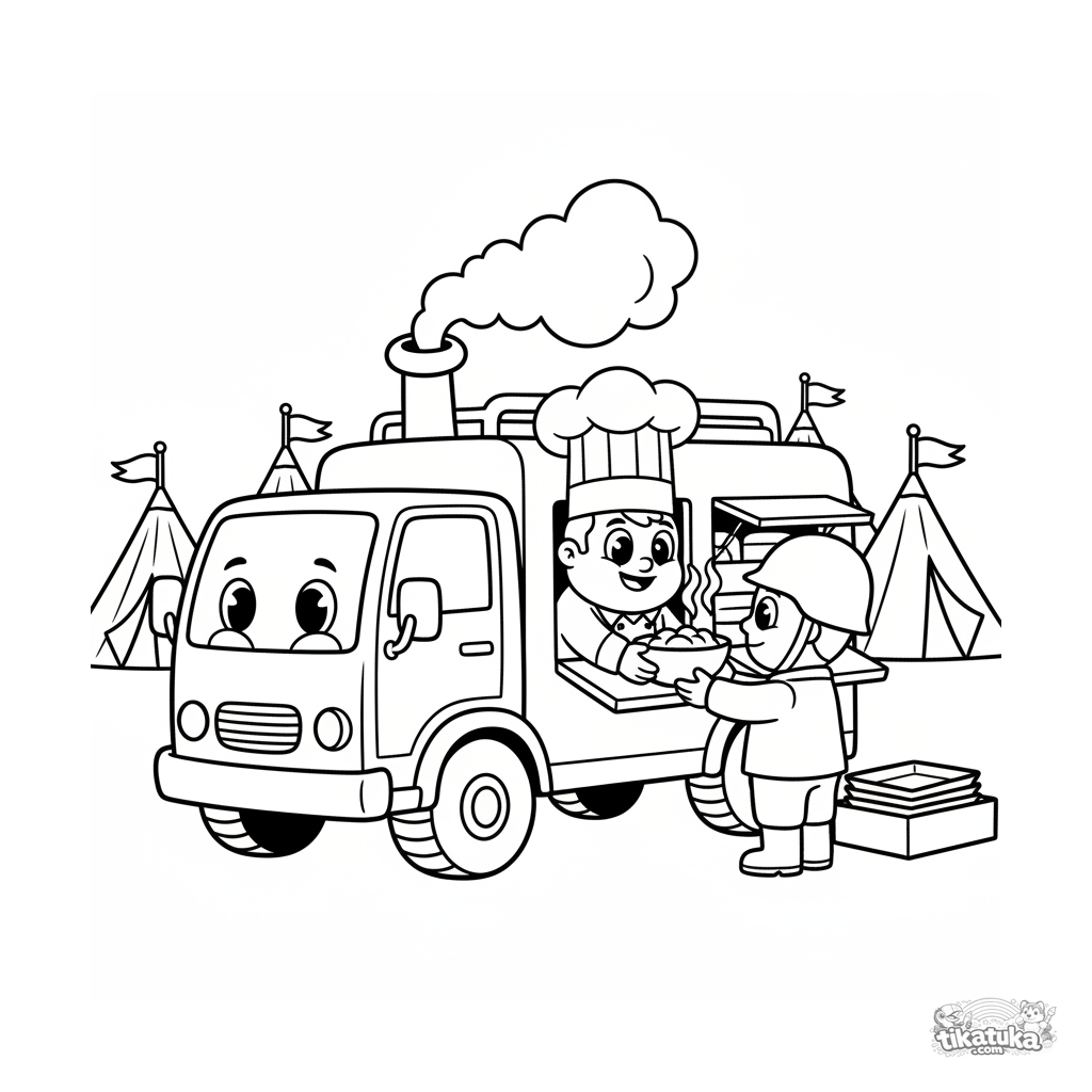 Coloring page for kids 4-6: a cheerful mobile field kitchen truck serves a meal at the field headquarters. A cook hands a bowl to a soldier. Friendly scene.