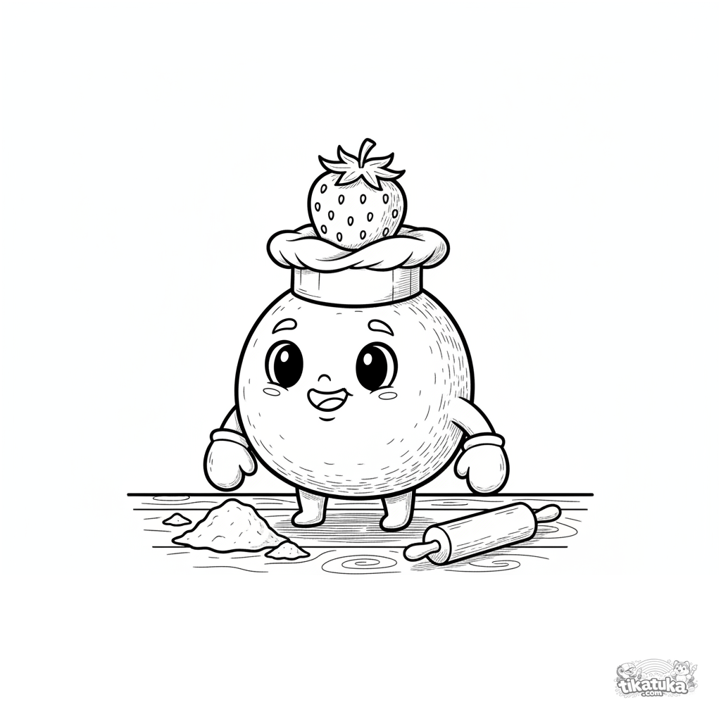Detailed coloring page for ages 10-12: a strawberry mochi dressed as a chef balances a berry on its head on a kitchen counter.