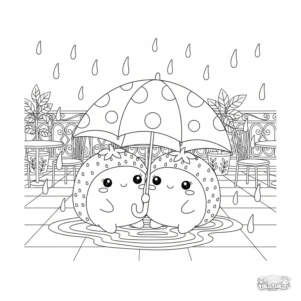Detailed coloring page for older kids 10-12: two strawberry mochi share an umbrella on a rainy cafe patio. A scene about friendship with rain texture and details.