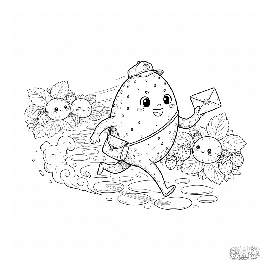 Detailed coloring page for kids 10-12: a mochi messenger rushing to deliver a letter along a garden path. Scene with motion and a background of strawberry plants.
