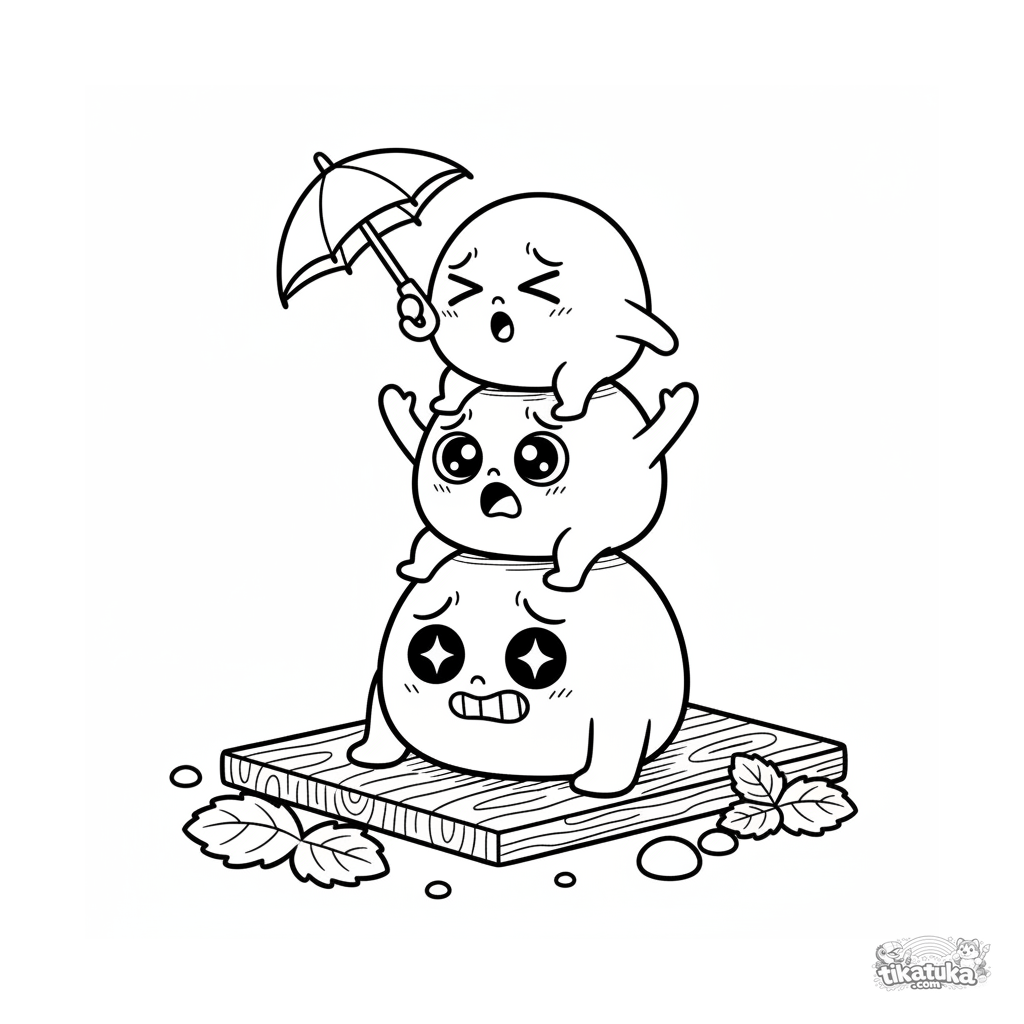 90s-style coloring page: a wobbly tower of three mochi trying to balance. A fun, comedic scene for tweens 7-9 years old.