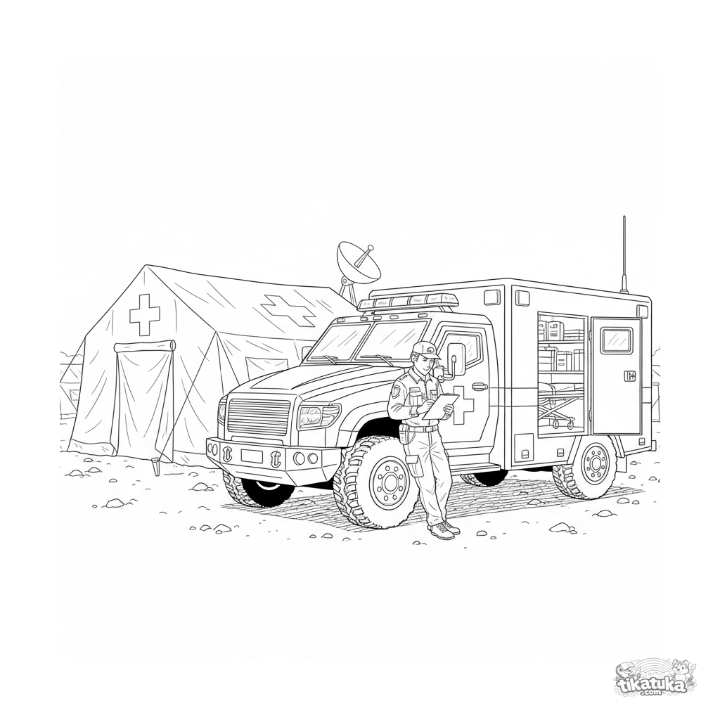 Detailed coloring page for ages 10-12: a modern armored ambulance vehicle parked at the medical tent of a field headquarters. Clean, realistic outlines.