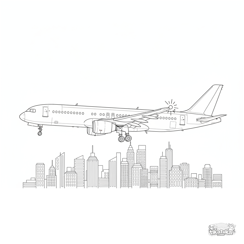 Coloring page for older kids 10-12: a modern airliner on landing approach over a night city. Detailed linework, technical elements.