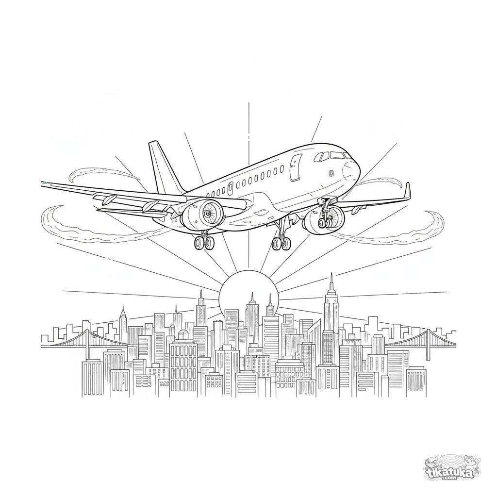 Detailed coloring page of a modern airliner on landing approach over a city skyline at sunset. For older kids 10-12. Realistic outlines, landing gear down.