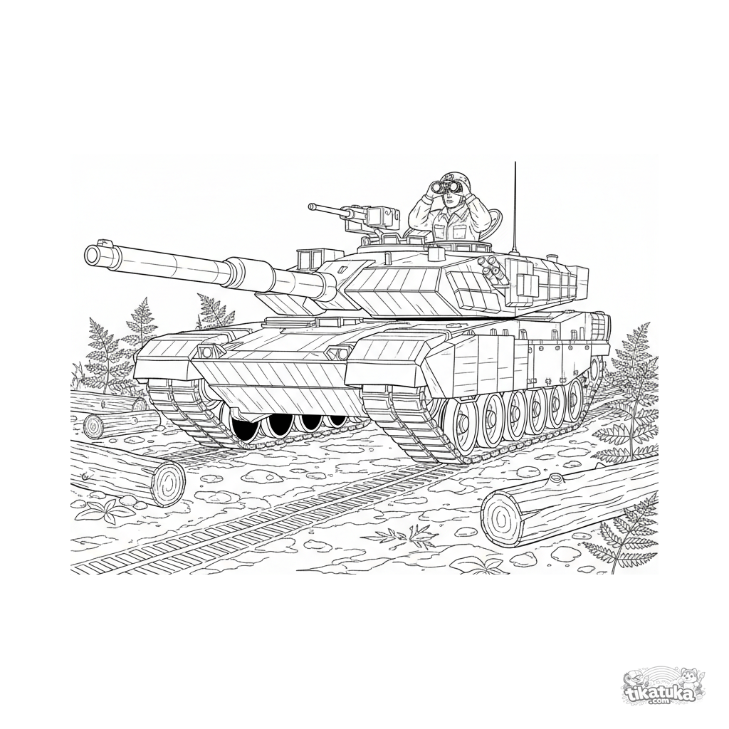 Detailed military vehicle coloring page for boys 7-12. A modern battle tank with camouflage netting is parked in a forest clearing, commander scanning with binoculars.