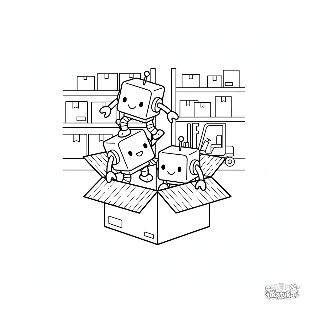 Fun coloring page with cube-shaped robots playing a stacking game in a warehouse. For kids 4-6 years old, with clear geometric shapes.