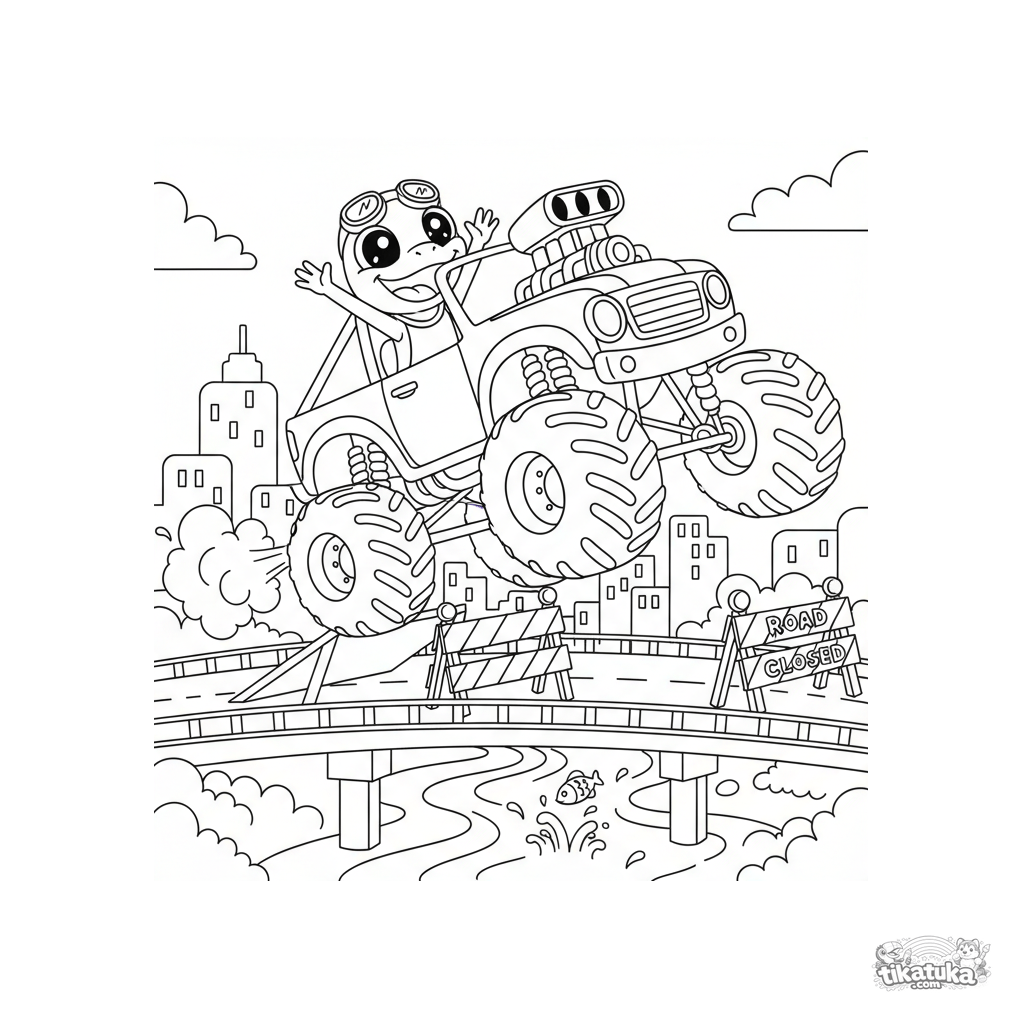 Coloring page for tweens 7-9: a huge monster truck makes an exciting jump off a ramp set up on a city bridge over a river. The lizard driver cheers. Dynamic composition, moderate detail.