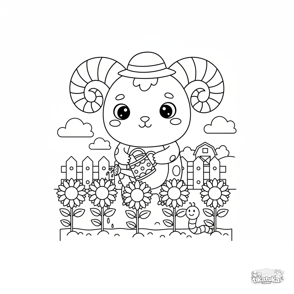 Kids coloring page: a monster with curly horns and a gardener's hat waters sunflowers in a patch. A kind scene about helping and caring for plants.