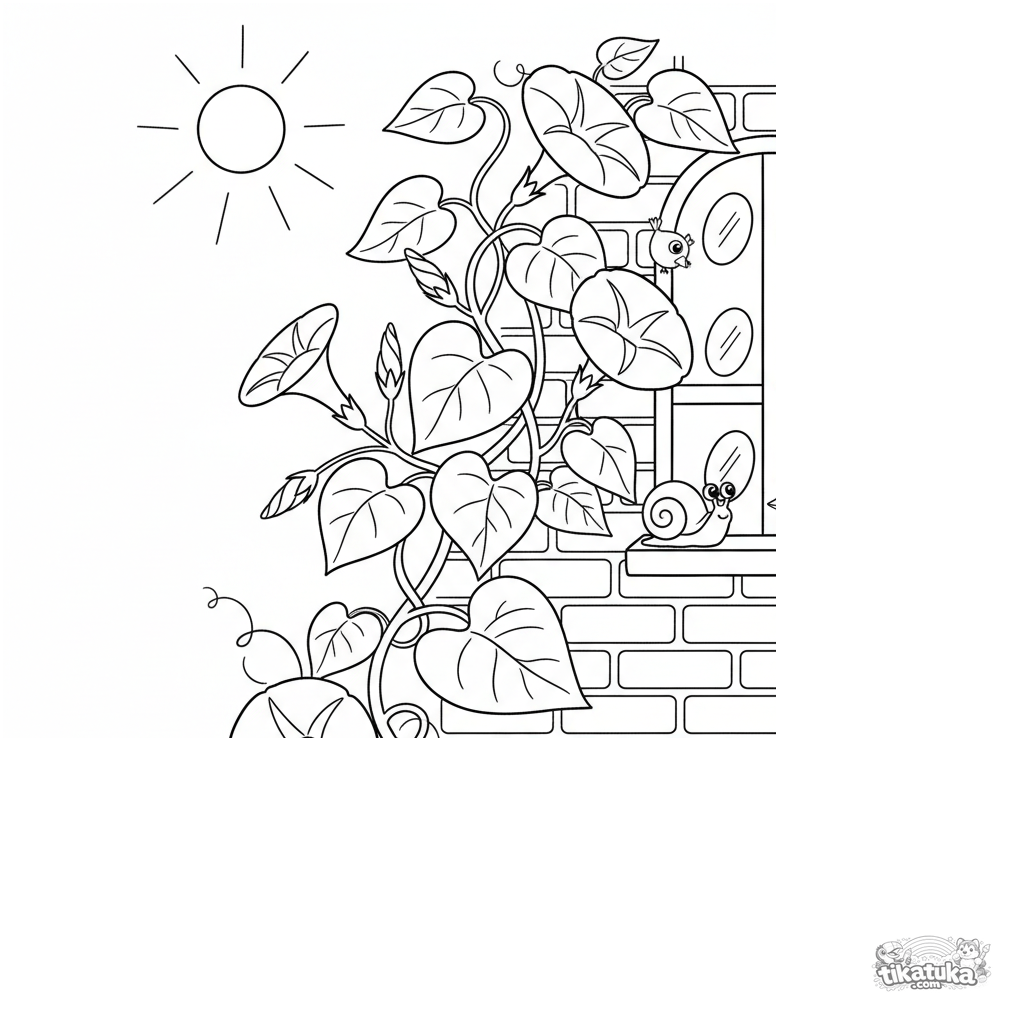Coloring page for kids 4-6: a climbing morning glory vine with trumpet flowers grows on a brick wall by a window. Snail on the stem, summer morning.
