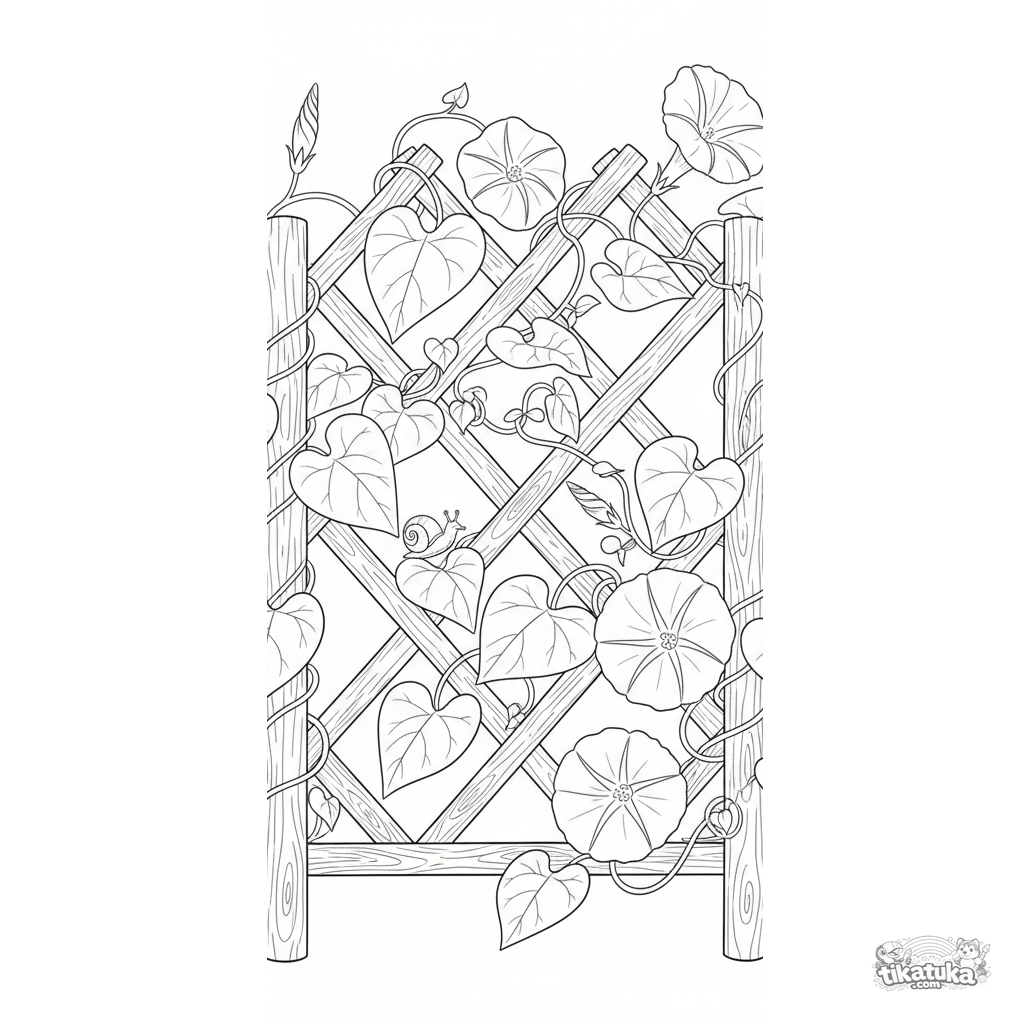 Complex coloring page for kids 10-12: a detailed morning glory vine climbing a garden trellis with a snail. Lots of textures and natural elements.