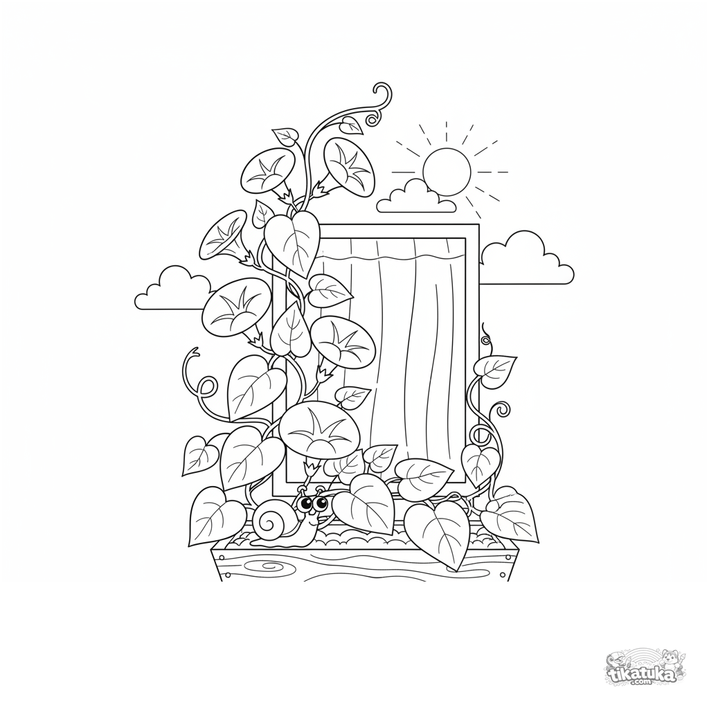 Coloring page for kids 7-9: a blooming morning glory vine climbs from a wooden window box, a snail on the rim. Cozy scene with a curtain, clear outlines.