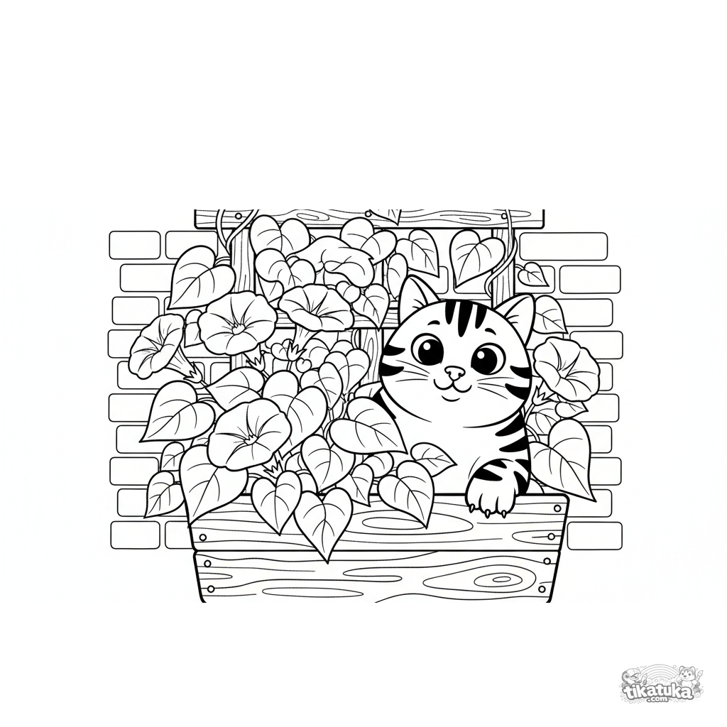 Coloring page for kids 4-6: a blooming morning glory vine in a wooden window box, a curious kitten peeking from behind the leaves. Bright folk art style.