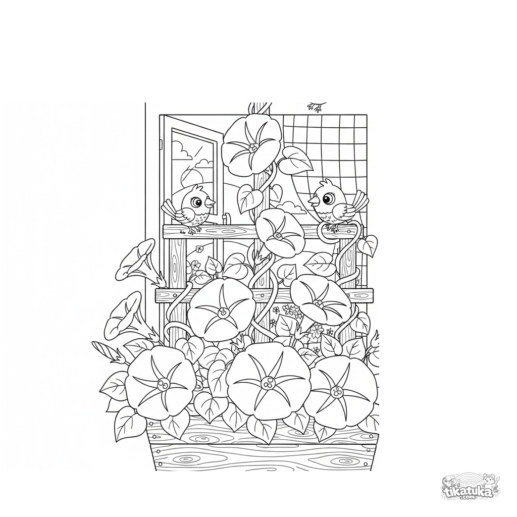 Coloring page for kids 4-6: morning glory flowers climb a trellis from a wooden window box below a curtained window. Cozy scene.