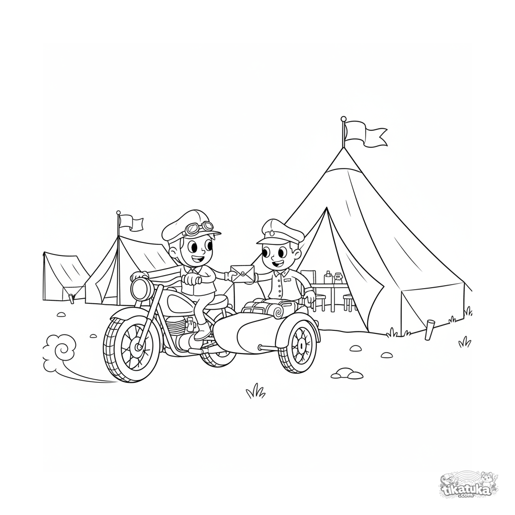 Coloring page of a vintage army motorcycle with a sidecar arriving at HQ. For kids 4-6. Messenger in goggles delivers a dispatch, features tents and a dust cloud.