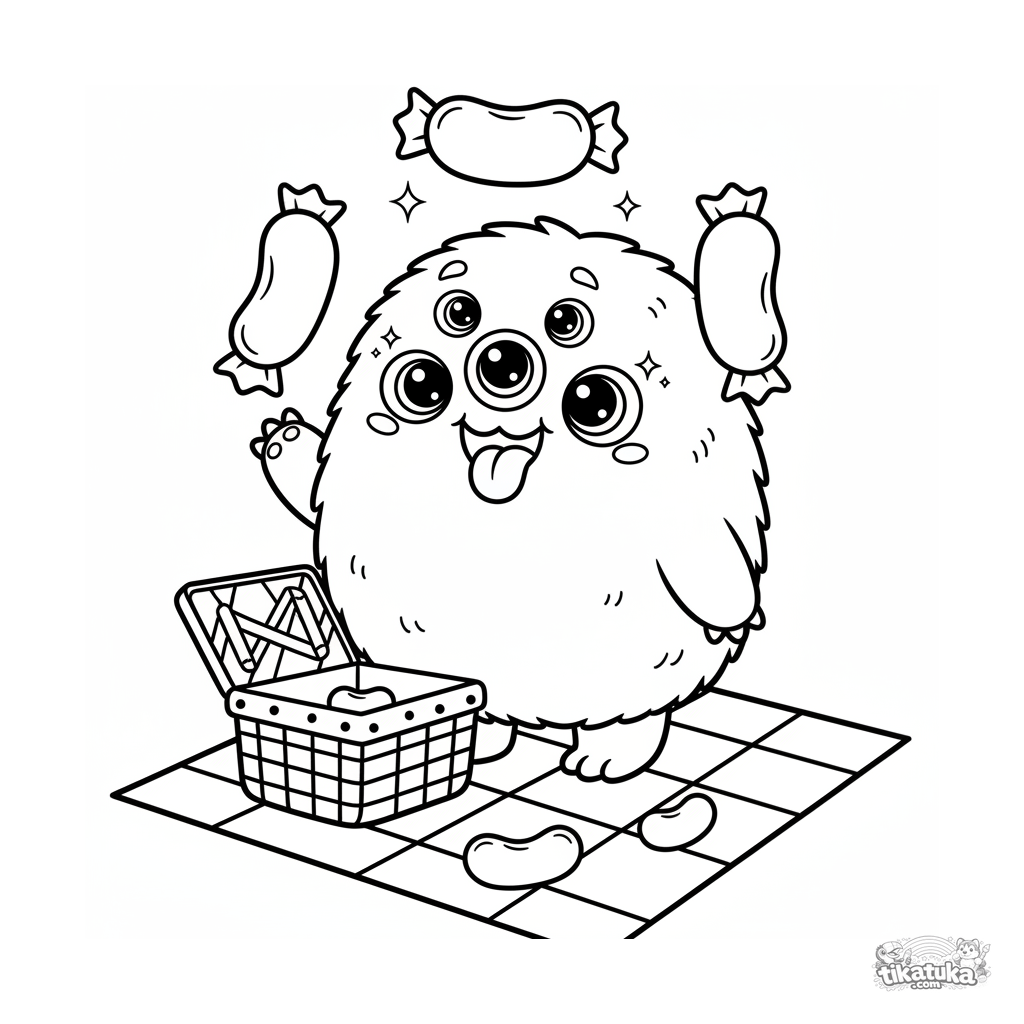 Coloring page for kids 7-9: a fluffy multi-eyed chibi monster juggling jelly beans at a picnic. A dynamic and funny scene.