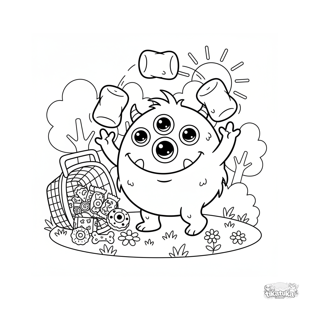 Coloring page of a happy multi-eyed monster juggling marshmallows at a picnic. For kids 4-6 years old. A bright and dynamic scene.