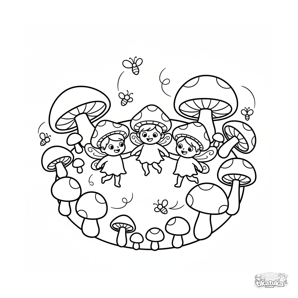 Simple toddler coloring page 2-3: three fairies dance in a ring inside a circle of giant mushrooms. Large, clear silhouettes in a paper-cut style.