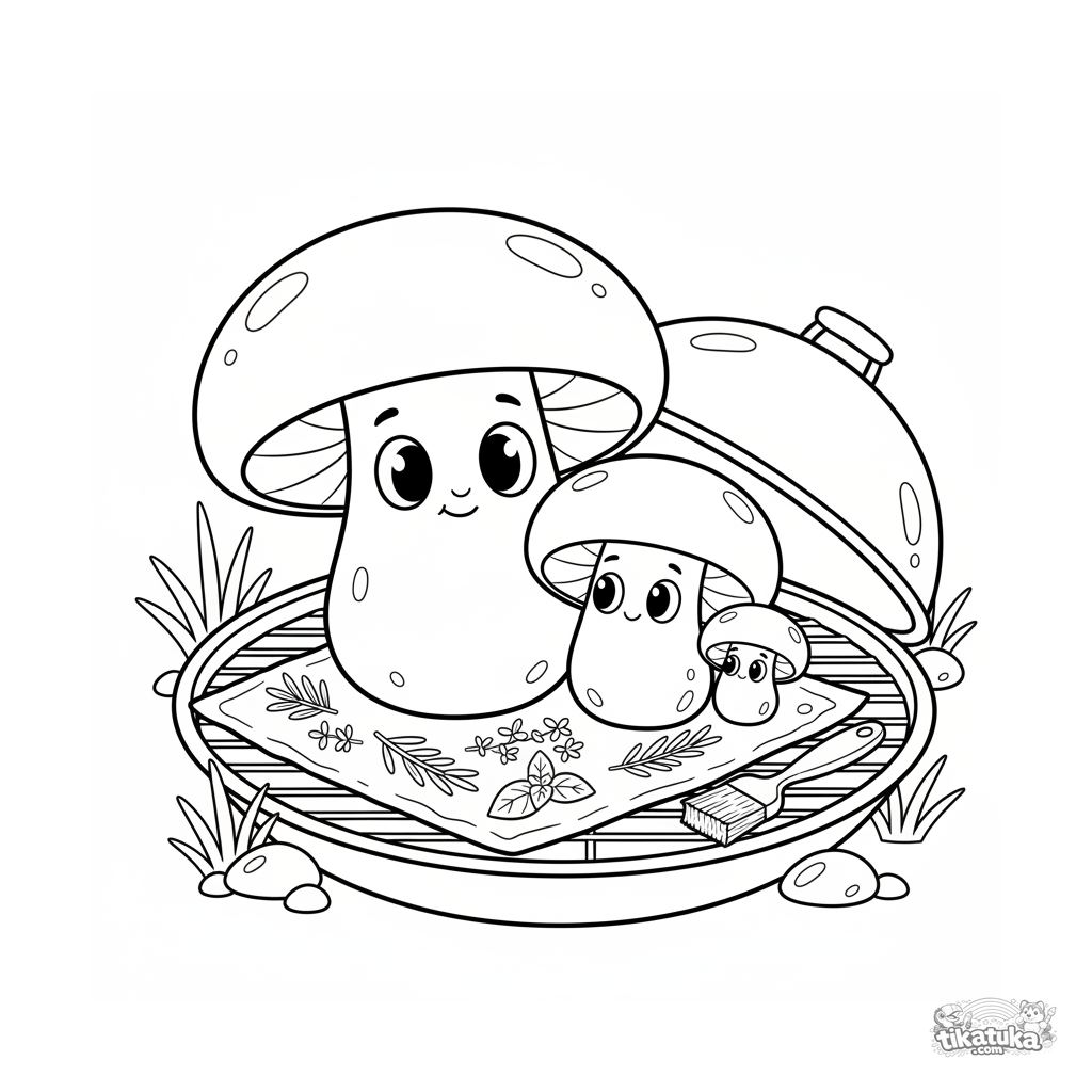 Coloring page for tweens 7-9: a family of portobello mushrooms relaxes on a garden grill. Warm storybook style, family theme, details of foil and herbs.