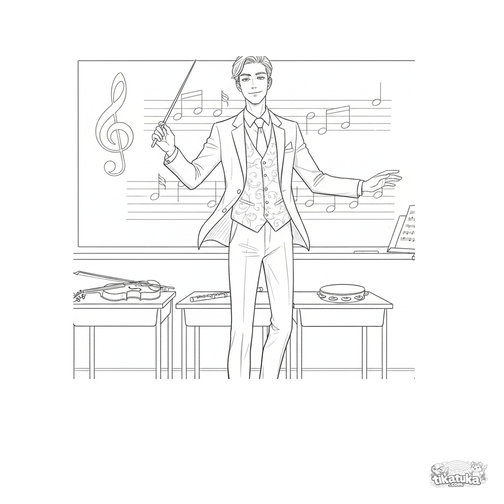 Coloring page for older kids 10-12: an enthusiastic music teacher conducts an imaginary orchestra of instruments in a classroom before a blackboard with musical notes.