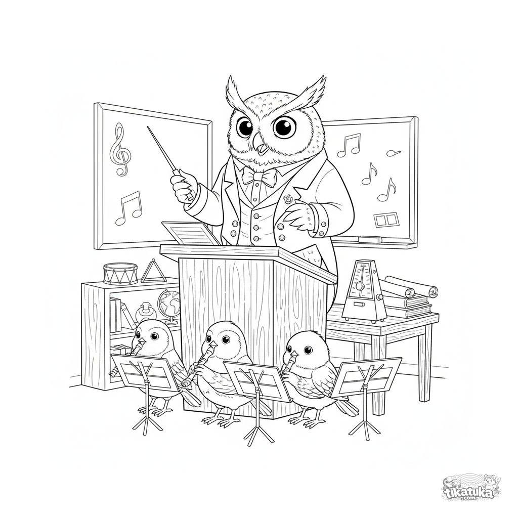 Coloring page for older kids 10-12: an owl music teacher in a classroom conducts an ensemble of small birds playing recorders. Music stands, metronome, detailed realistic scene.