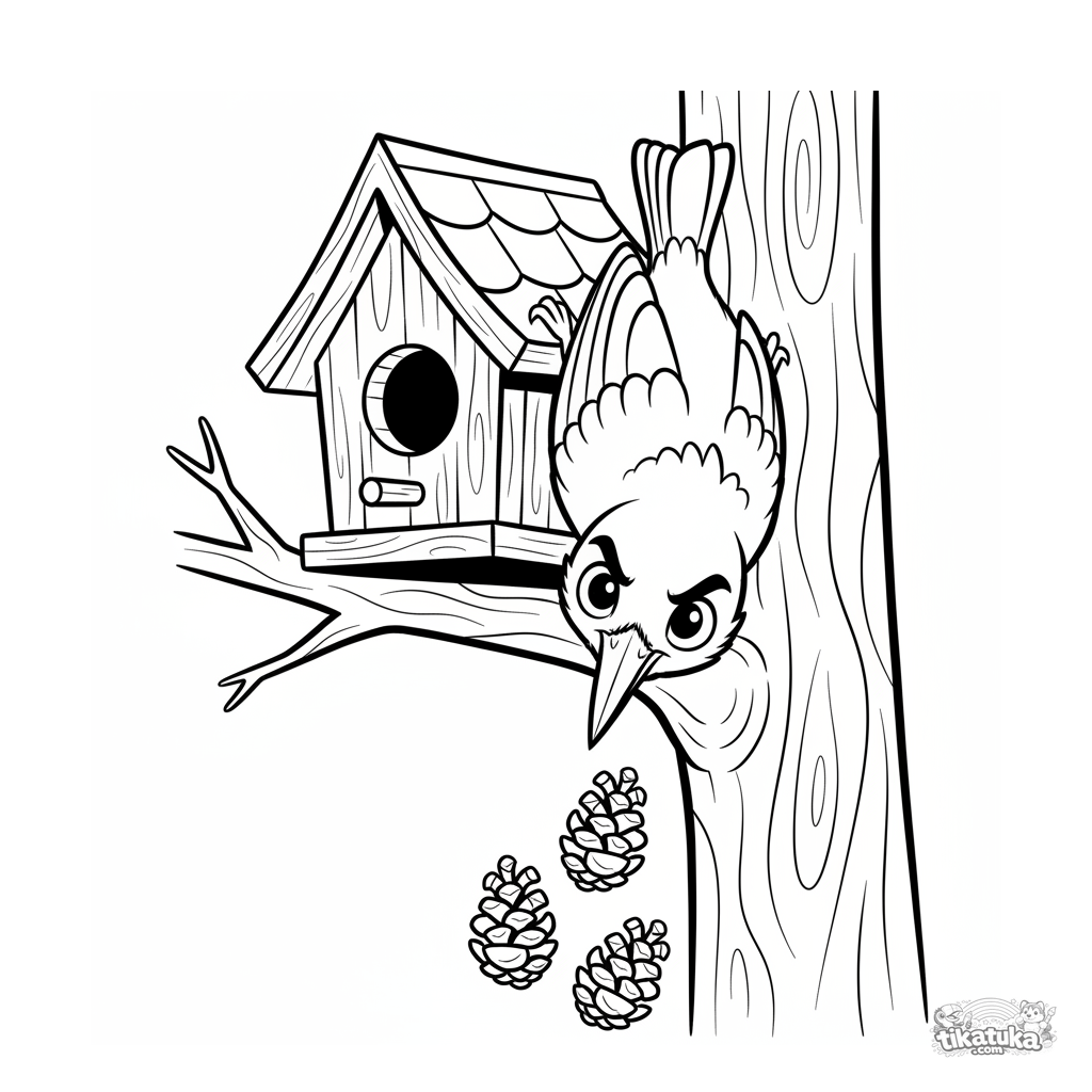 Coloring page for tweens 7-9: an agile nuthatch hangs upside-down from the roof of a wooden birdhouse. Dynamic pose, expressive features in comic-adventure style, roof details.