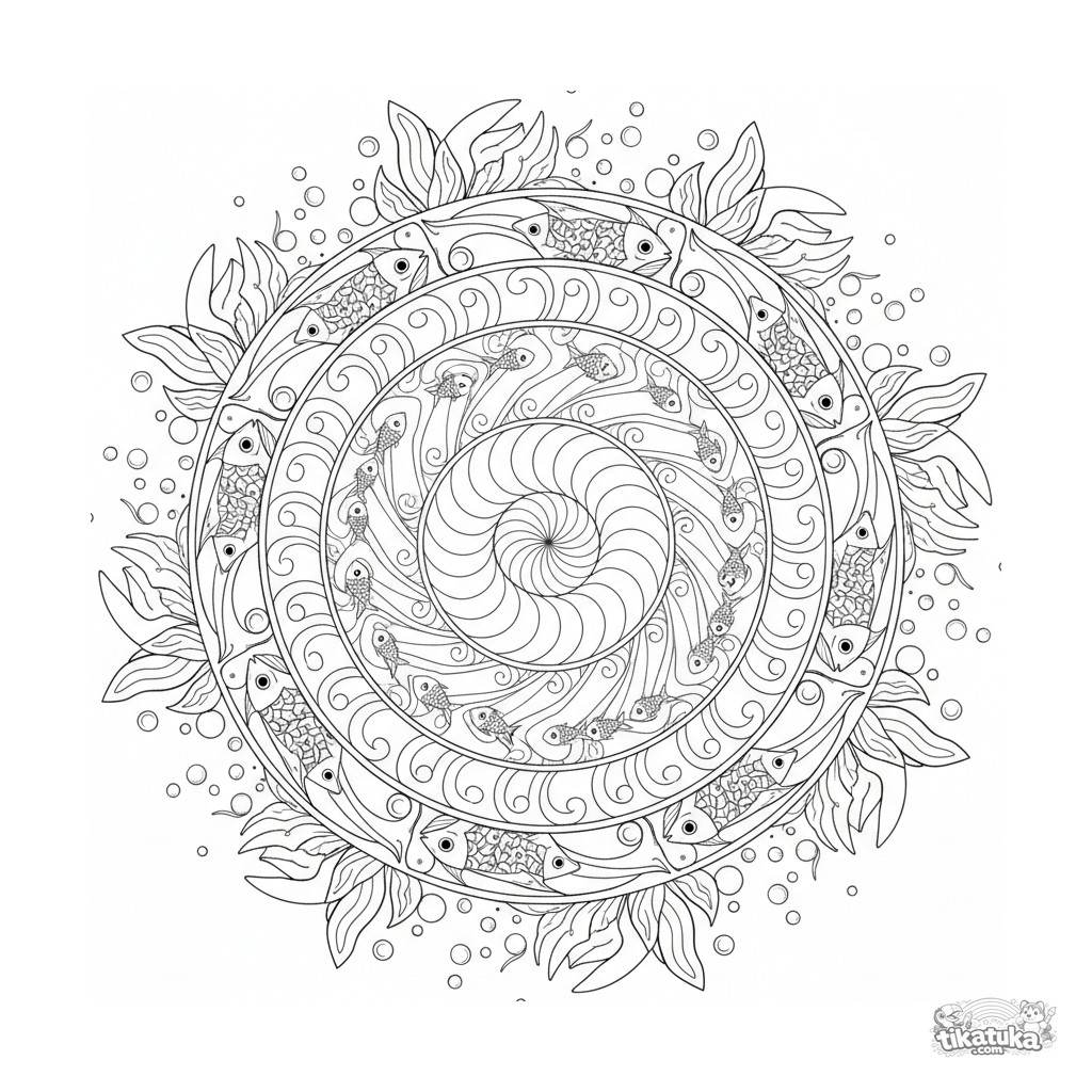 Detailed ocean mandala coloring page with a shell, waves, and fish for kids 10-12. A symmetrical underwater world with many elements for creative coloring.