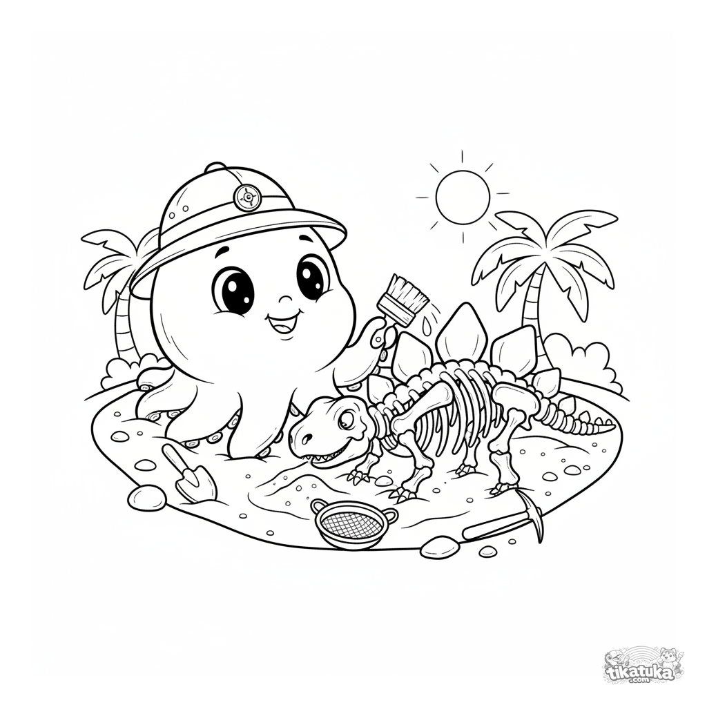 Coloring page for kids 4-6: a cute octopus archaeologist brushes sand off a dinosaur fossil. Simple lines, Scandinavian toy style, wide margins for coloring.