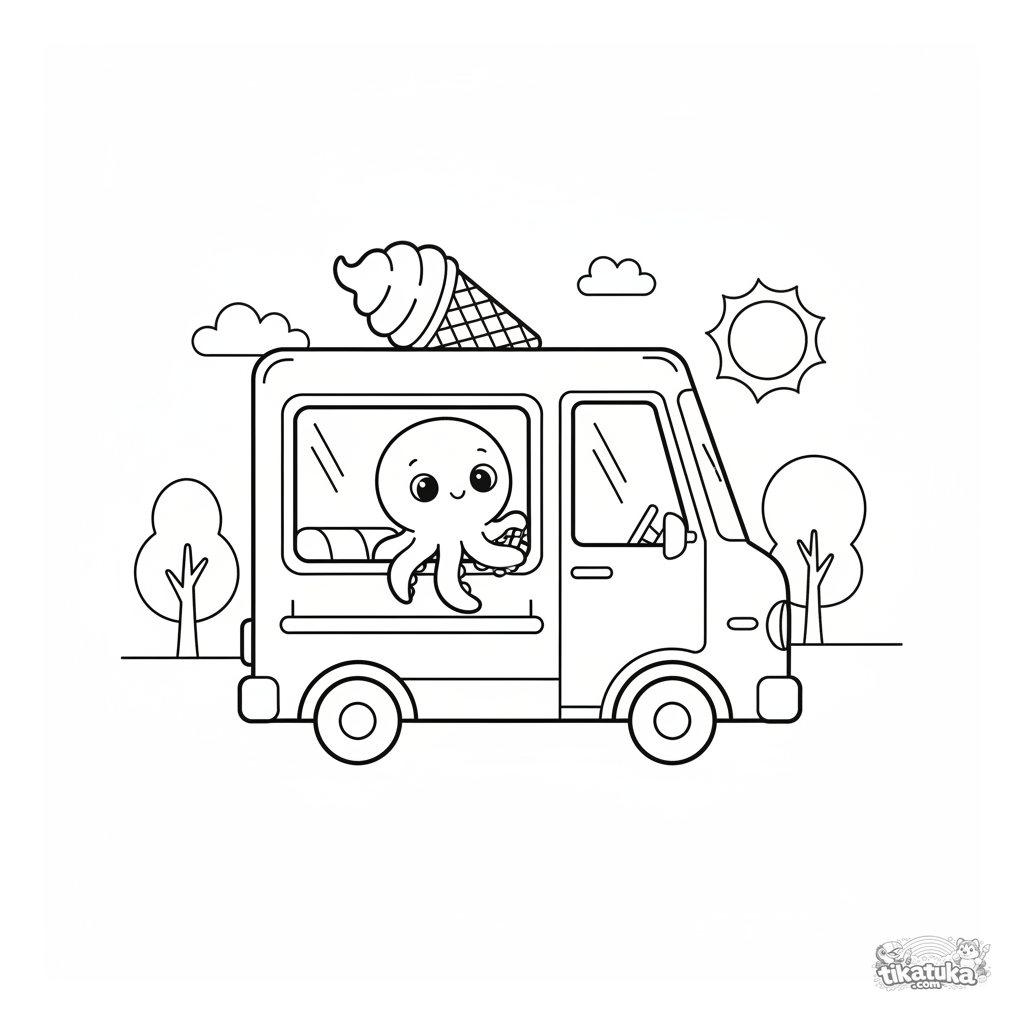 Coloring page for boys 4-6: Octopus Bublik drives a cheerful ice cream truck. Simple geometric shapes, wooden-toy style.