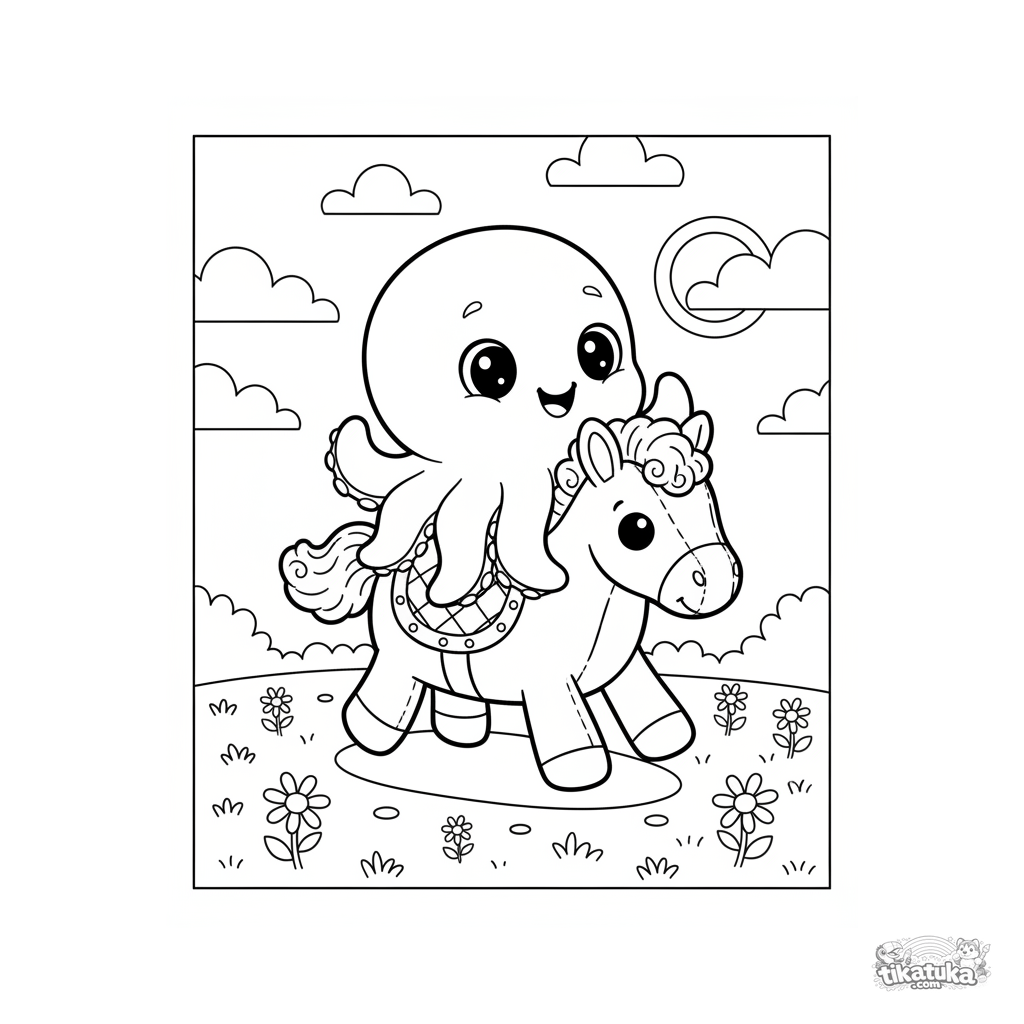 Kids coloring page: cute Octopus Bublik riding a toy pony in a meadow. Simple lines, wide margins, suitable for ages 4-6.