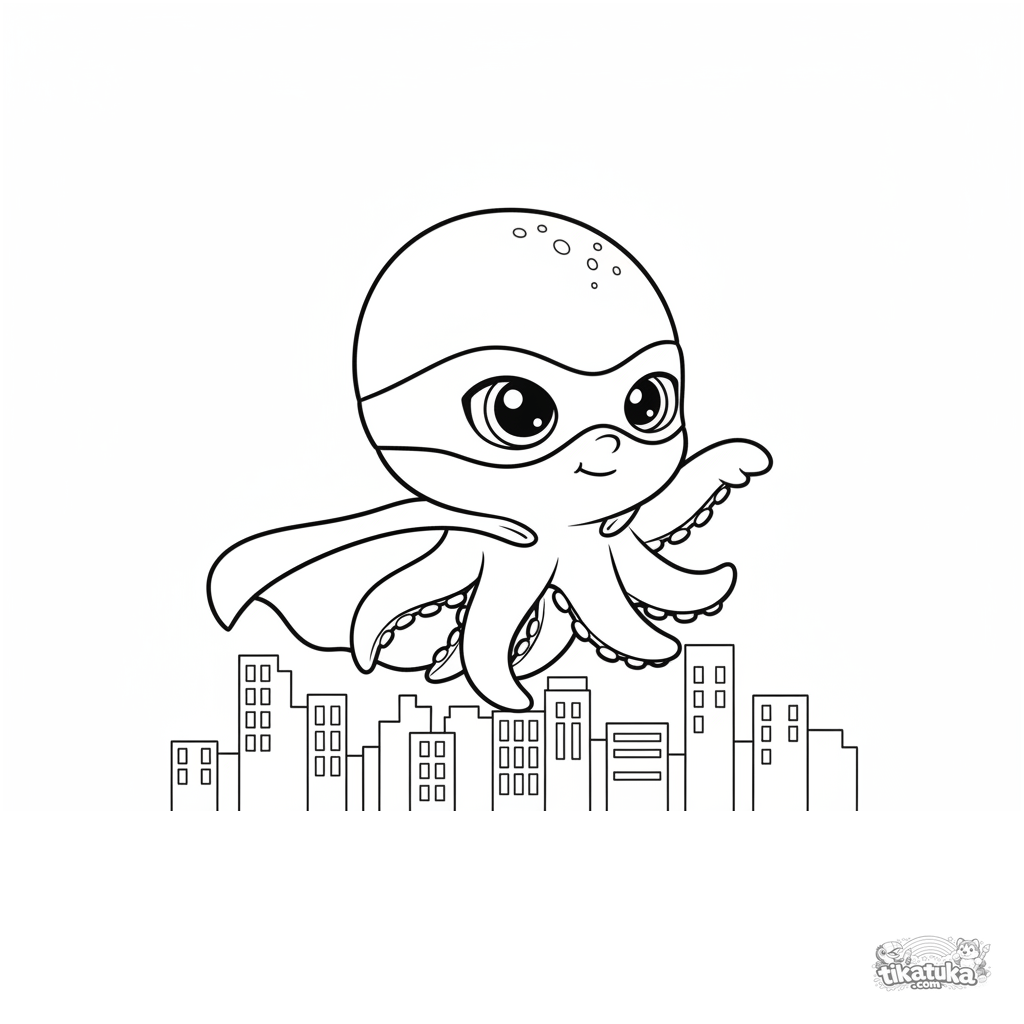 Coloring page for kids 4-6: Octopus Bublik in a superhero cape flies over the city. Dynamic pose, simple skyline silhouette.