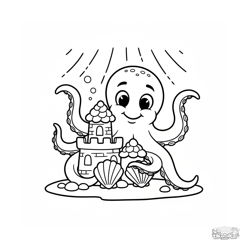 Simple coloring page of a playful octopus playing hide and seek by a shell castle in sunny shallows. For toddlers 2-3.