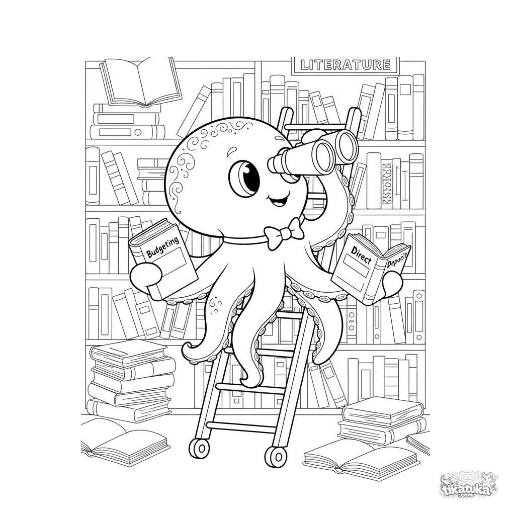 Coloring page for kids 10-12: a smart octopus in a library uses binoculars and a ladder to search for financial literature. A detailed, funny scene in a paper-cut style.