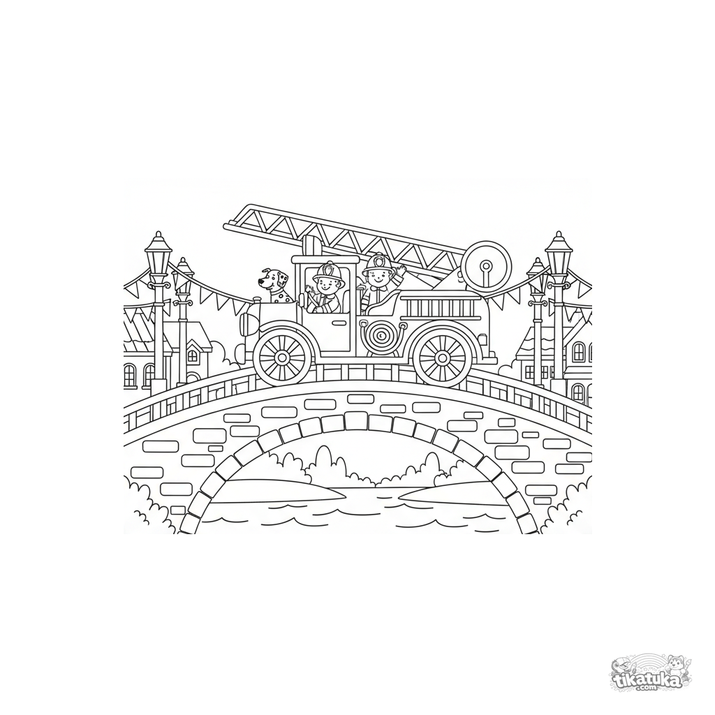 Coloring page for boys 7-9 years old: an old-fashioned fire engine participates in a festive parade on a decorated bridge over a river. Warm storybook style, historical details, friendly atmosphere.
