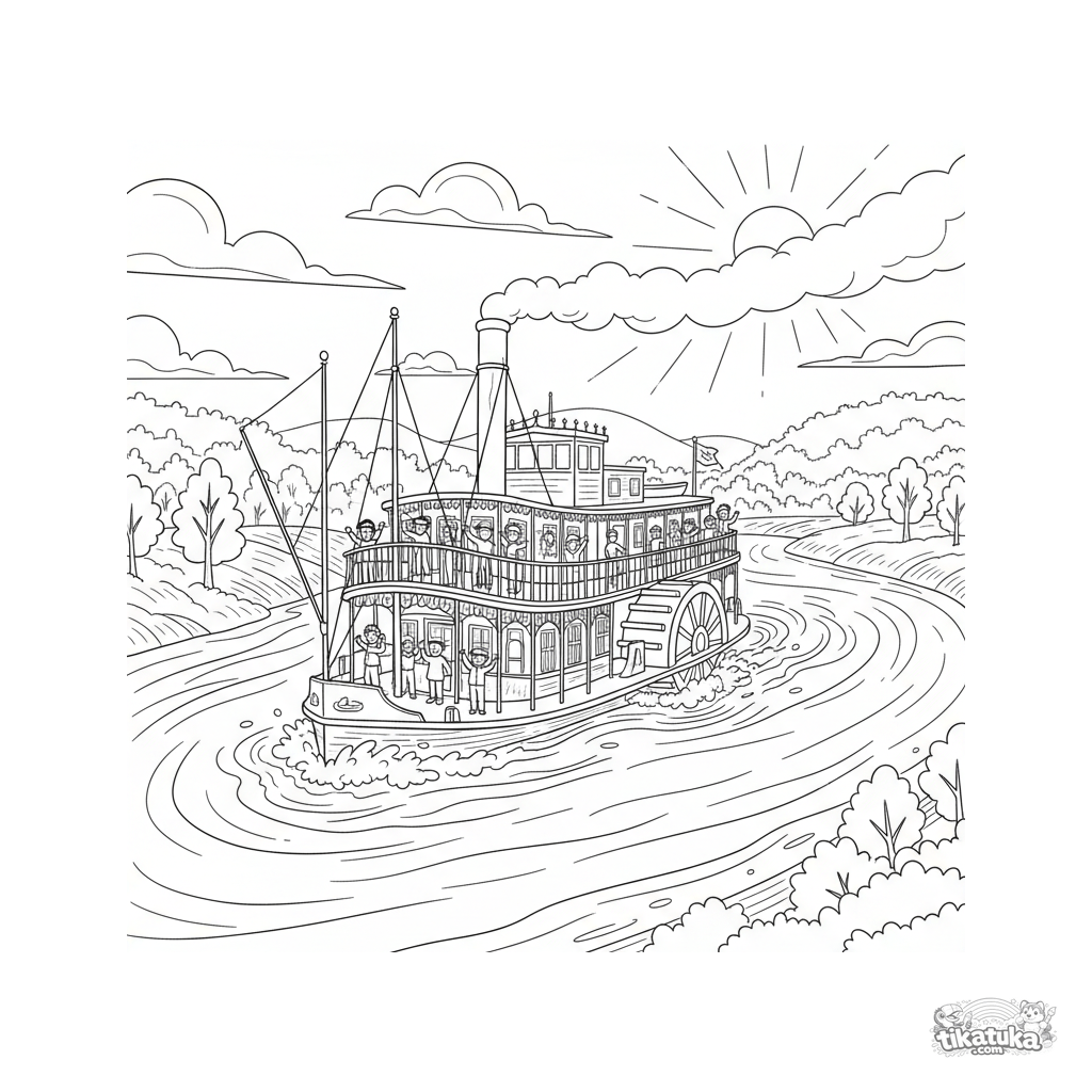 Coloring page for kids 4-6: a vintage paddle steamer sails down a river at sunset. Passengers wave from the deck, the large paddle wheel churns.