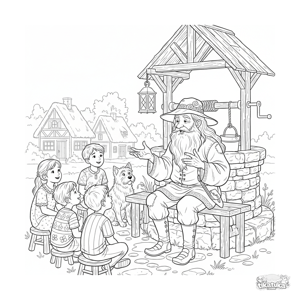 Coloring page for older kids 10-12: an old storyteller recounts a tale about living water at the village well. Detailed scene in a vintage engraving style with children and a dog.
