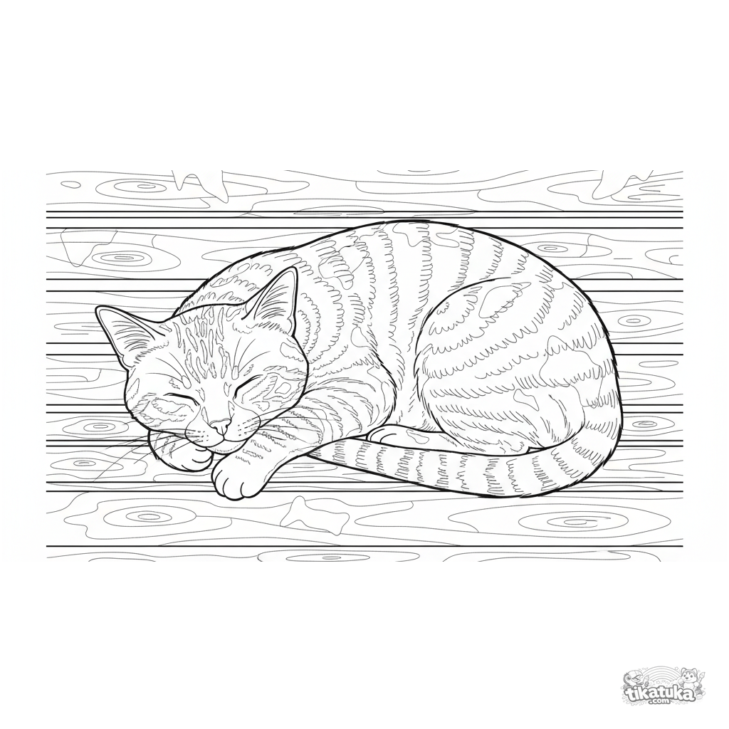 Coloring page for older kids 10-12: an old tabby cat naps peacefully on a sunny park bench, a detailed scene with dappled light.