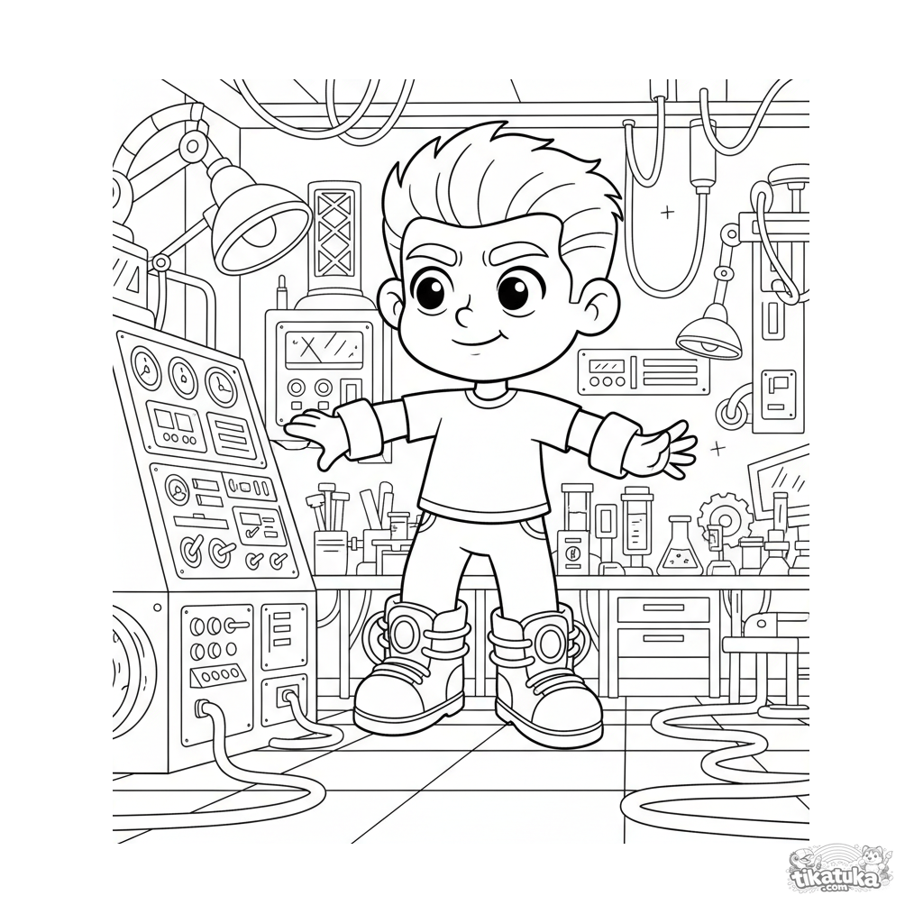 Detailed coloring page for older kids 10-12: a boy tests experimental magnetic levitation boots in a secret inventor's laboratory.