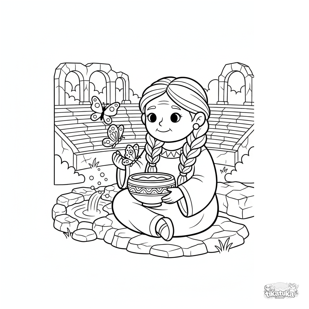 Kids coloring page: a wise oracle by a spring in an ancient amphitheater releases magical butterflies. A calm scene, suitable for children aged 6-10.
