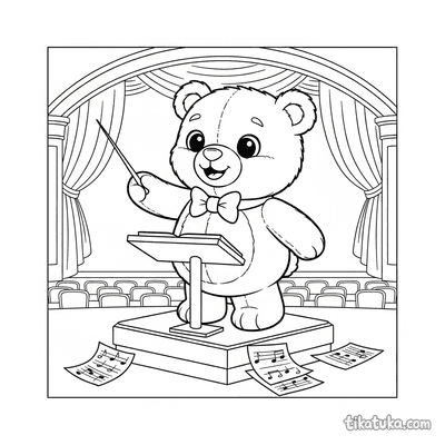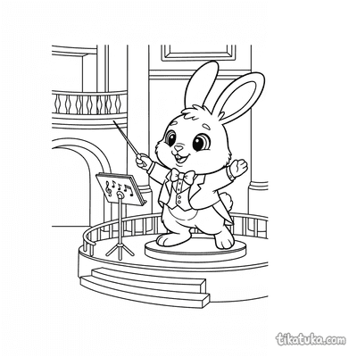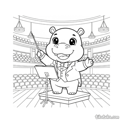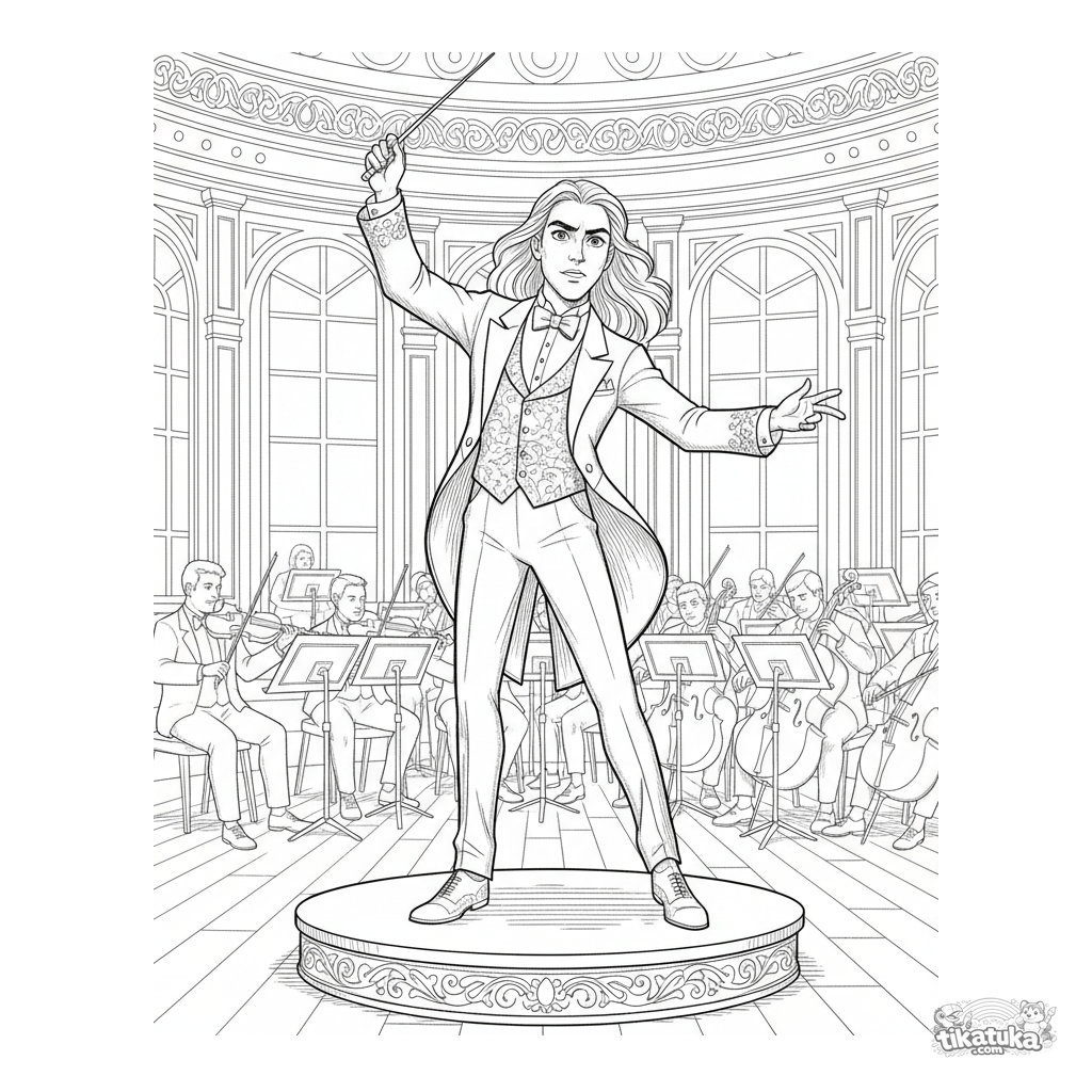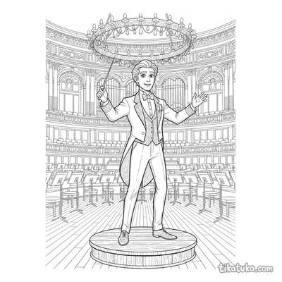 Coloring page for older kids 10-12 years: a conductor at the climax of a piece on a concert hall stage. High detail level, dynamic pose.