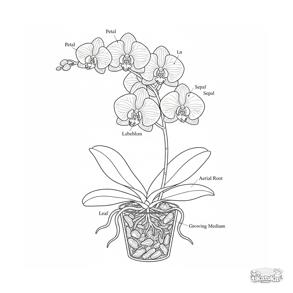 Intricate botanical coloring page for older kids 10-12. Detailed illustration of a potted orchid with aerial roots. Clean cross-hatch style, many inner lines, vintage engraving aesthetic.