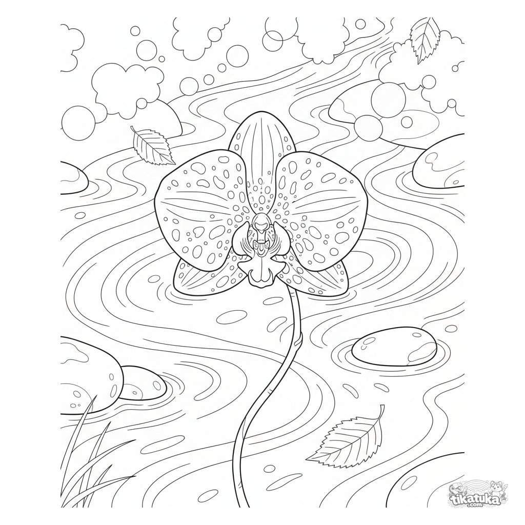 Detailed coloring page for ages 10-12: a realistic orchid with spotted petals floats on a forest stream. Intricate stones and leaves.