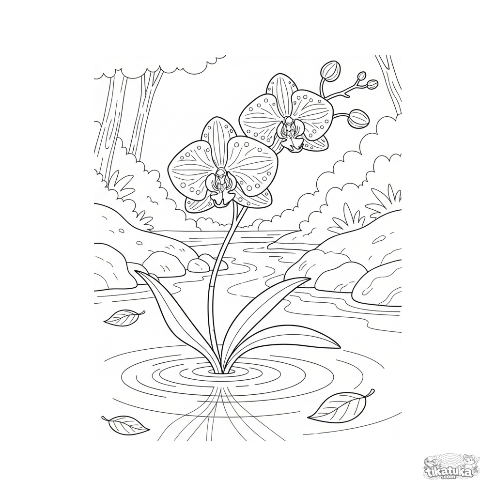 Coloring page for tweens 7-9: an elegant orchid floating on a forest stream with reflections. Moderate detail with expressive line work.
