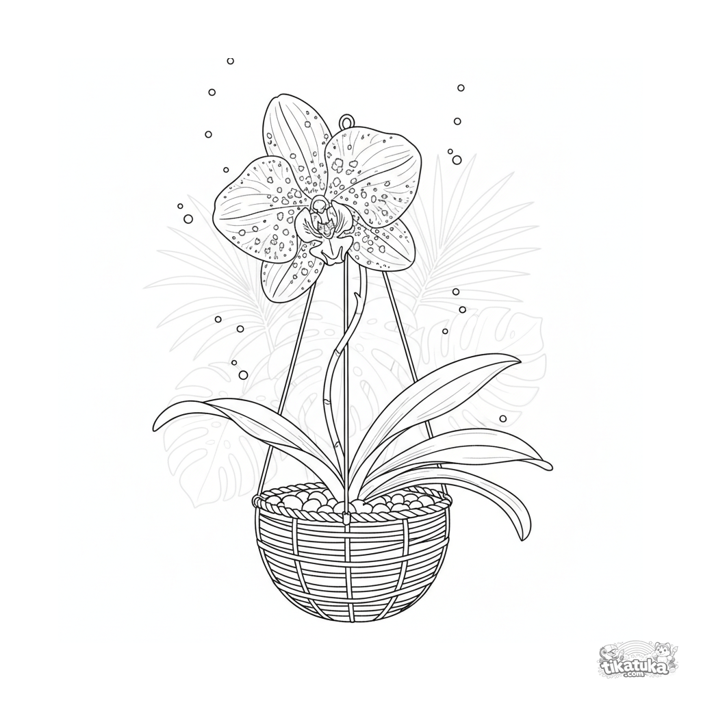 Complex coloring page for ages 10-12: a detailed orchid in a hanging basket inside a greenhouse with mist droplets. Tropical atmosphere.