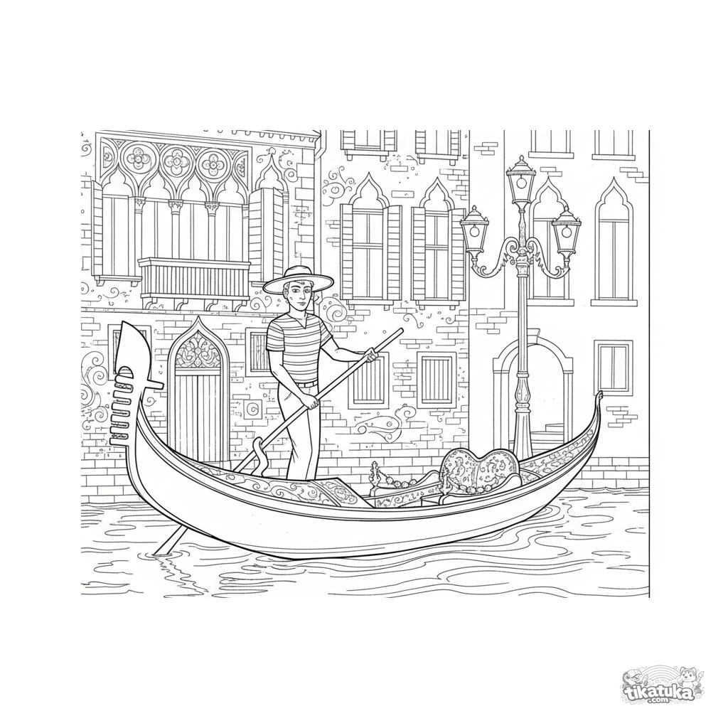 Detailed coloring page for older kids 10-12: an ornate Venetian gondola glides down a canal at sunset. Water reflections, architecture, and mood require attention to detail while coloring.