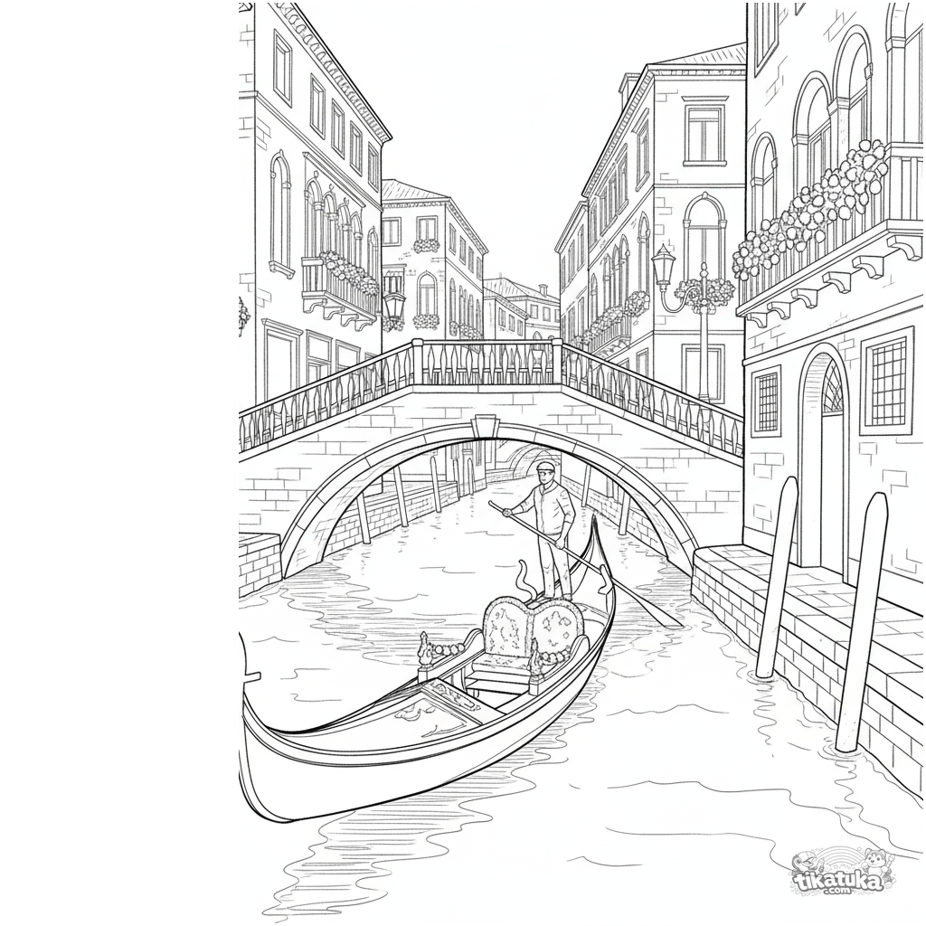 Coloring page for tweens 7-9: a detailed Venetian gondola glides under a stone bridge. Architectural elements and flowers to develop attentiveness.