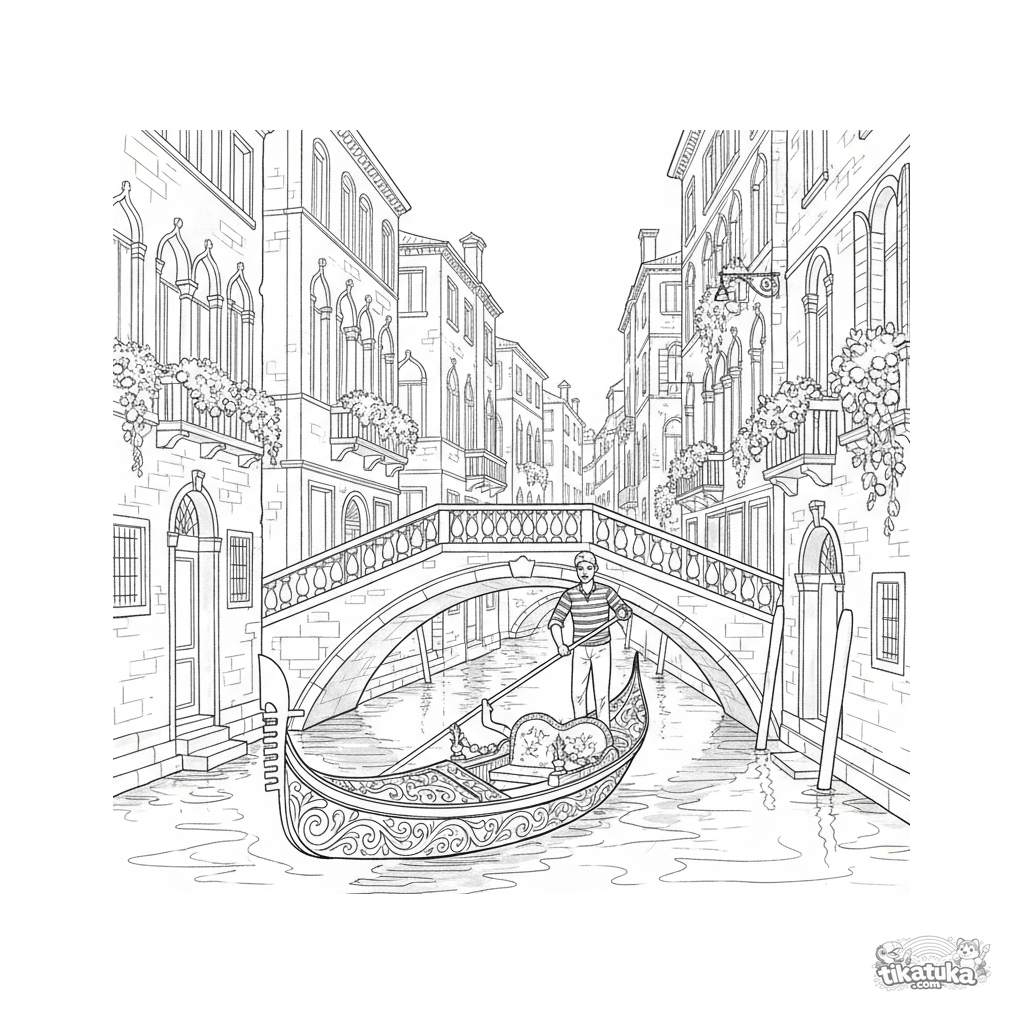 Detailed coloring page for older kids 10-12: an ornate Venetian gondola glides under a stone bridge on a canal. Buildings with flower boxes, a gondolier. Elegant scene.