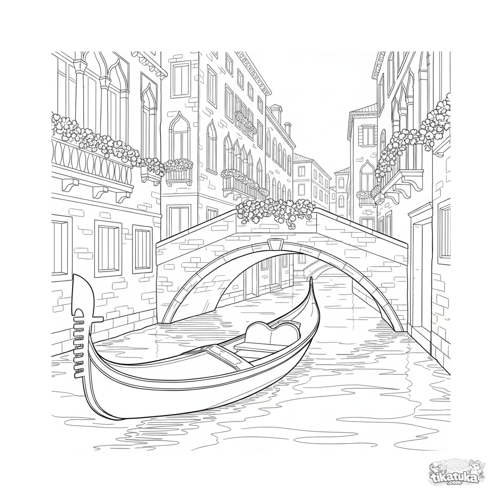 Coloring page for tweens 7-9: a detailed Venetian gondola glides under a stone bridge on a canal, with colorful buildings and flower boxes in the background.
