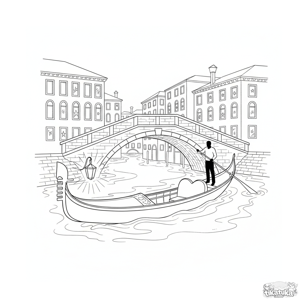 Coloring page for tweens 7-9: a detailed Venetian gondola with a lantern glides under a stone bridge at dusk. Atmospheric canal scene.